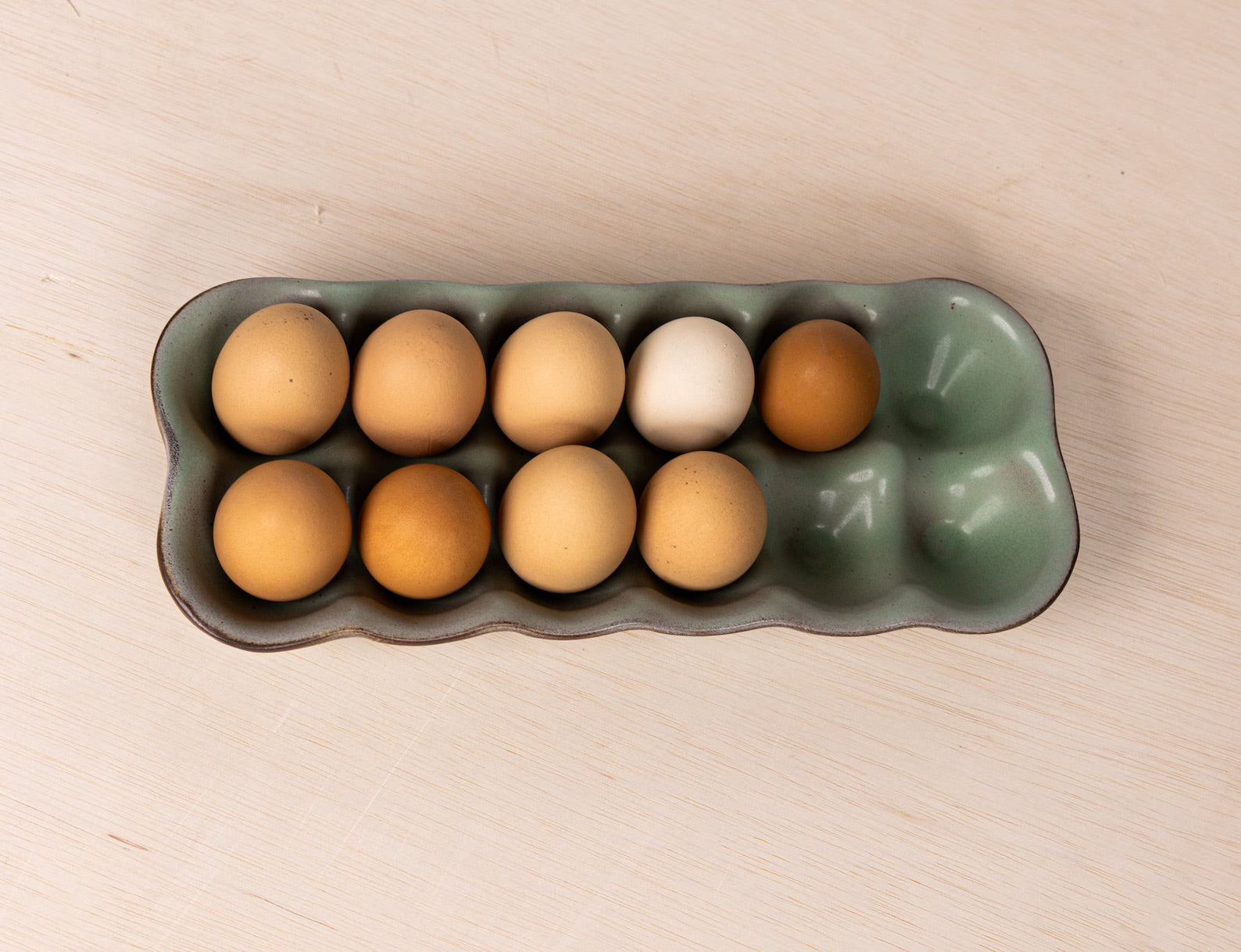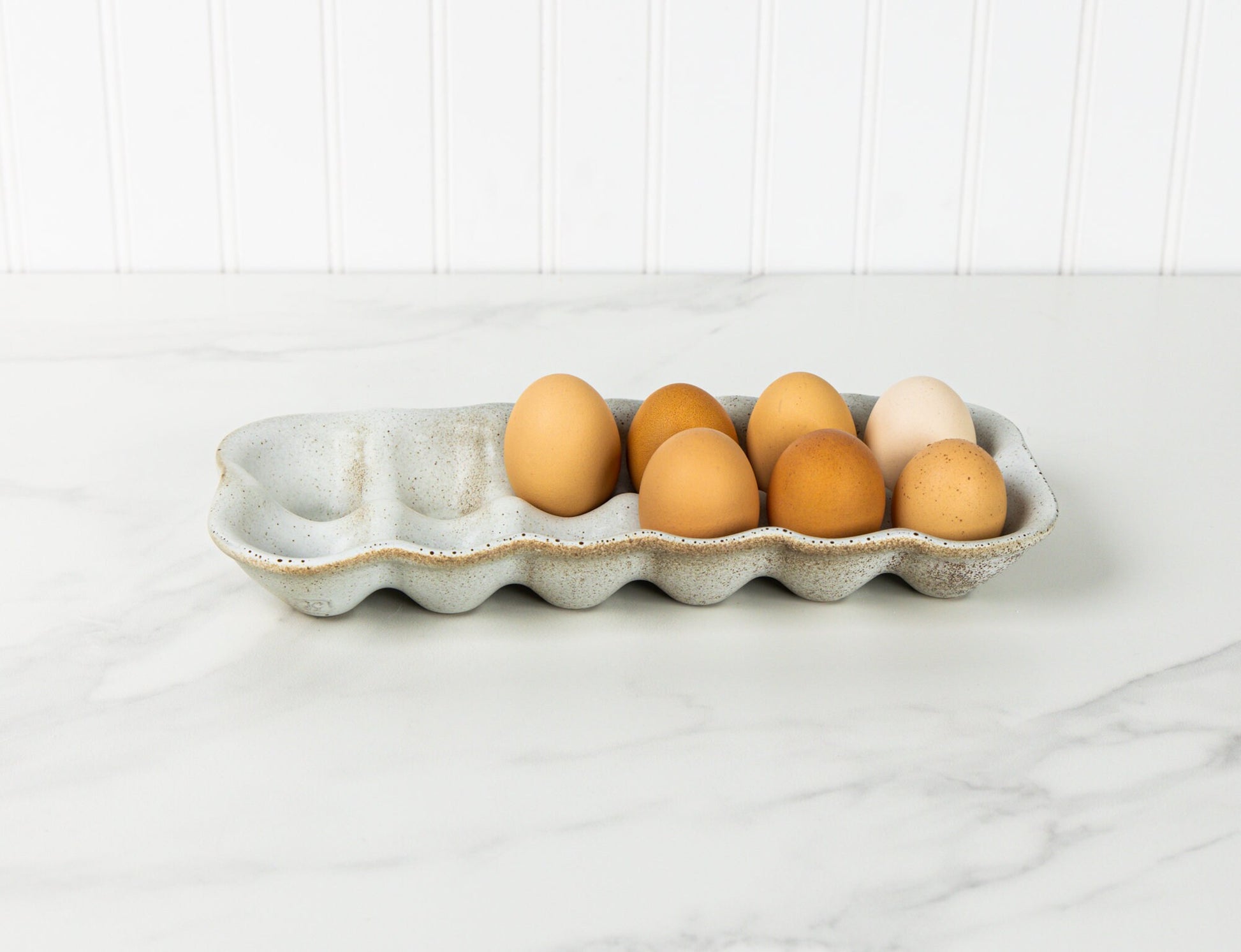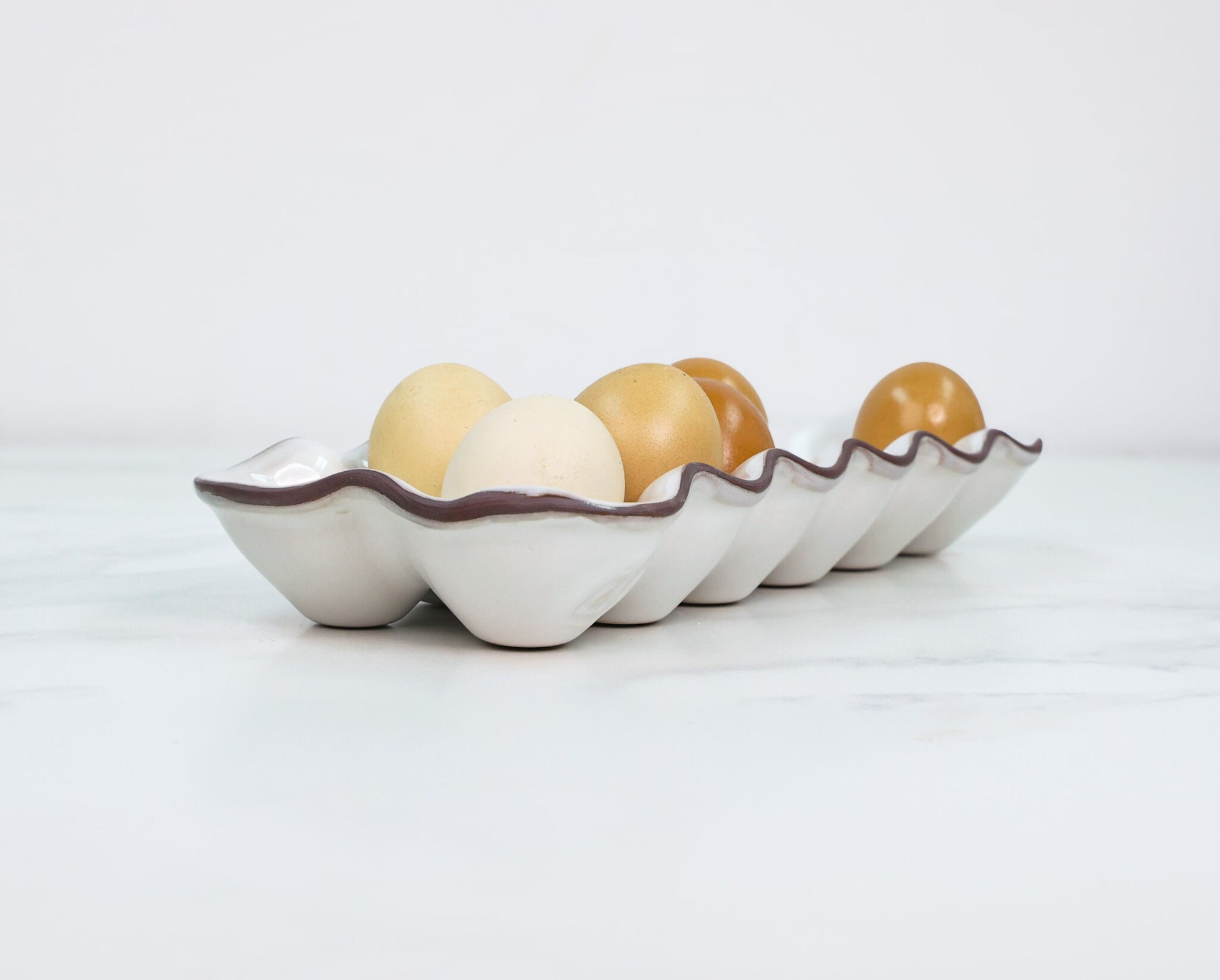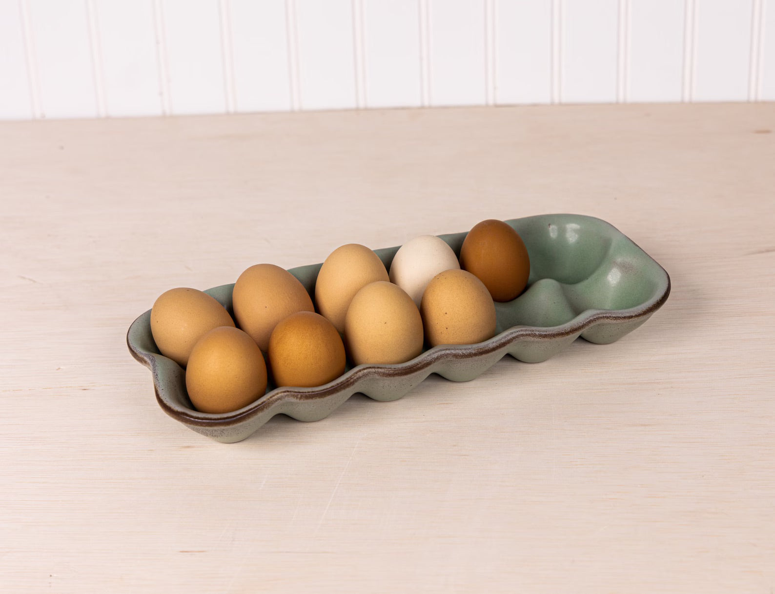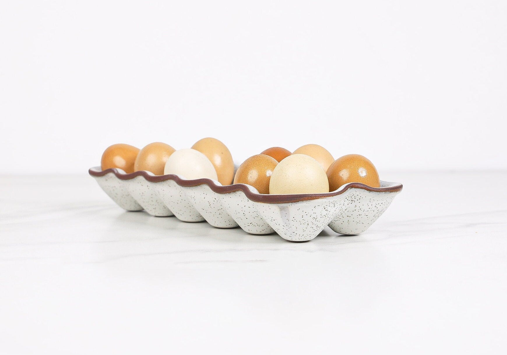 A durable and reusable alternative to cardboard cartons, this ceramic egg holder turns a practical necessity into a thoughtful, well-made kitchen essential. Each piece is shaped, glazed, and kiln-fired in small batches, ensuring every crate has its own subtle character.