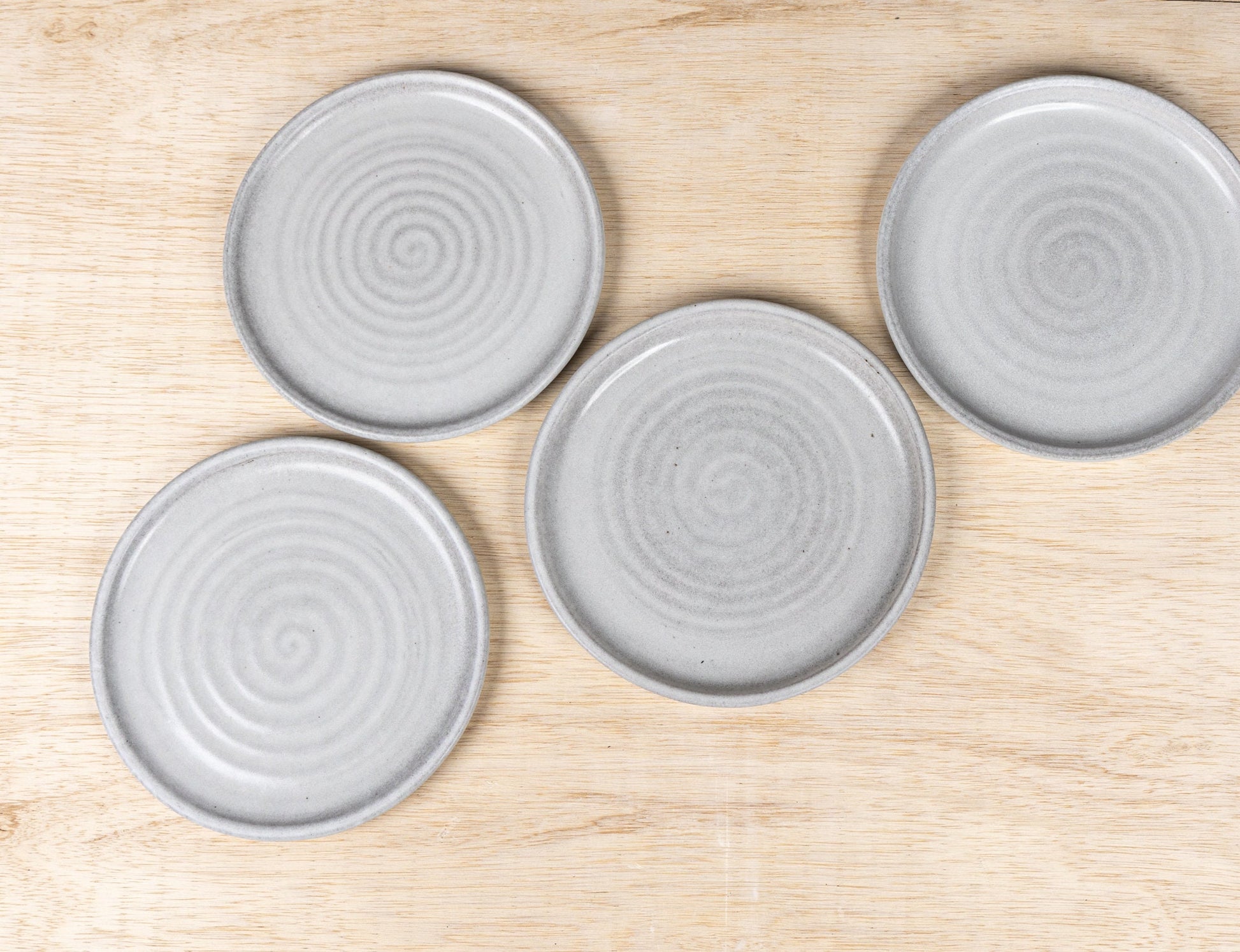 This set of four handmade stoneware dinner plates brings timeless craftsmanship and understated beauty to the table. Each 8.5-inch plate is wheel-thrown from durable American stoneware and finished in our signature Folk Farm glaze — a soft blue-gray matte with gentle brown speckling and a warm halo at the rim.